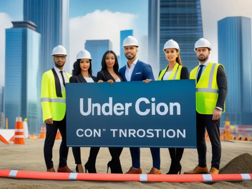 Jóvenes emprendedores exitosos construyendo imperio inmobiliario en ciudad futurista
