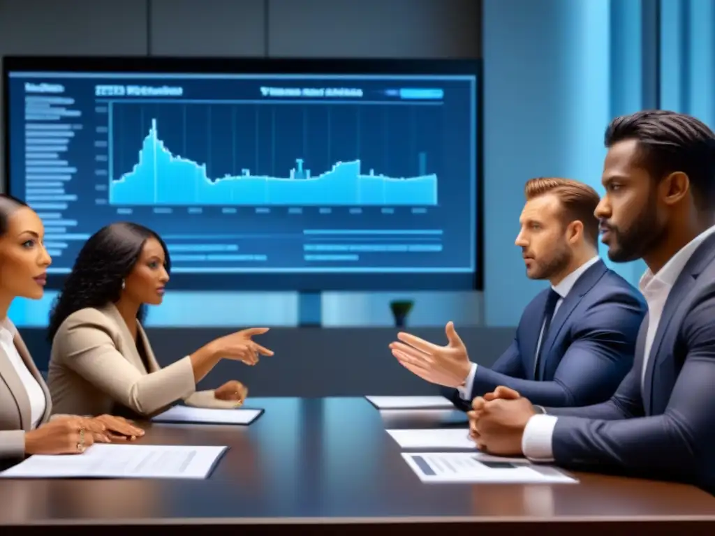 Inversores profesionales diversificados discuten estrategias en una sala futurista con gráficos holográficos