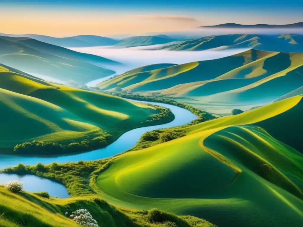 Escena serena de colinas verdes y río, bañada por la cálida luz del atardecer