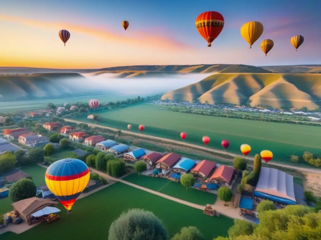 Vista aérea de un animado pueblo fronterizo al atardecer, con un mercado bullicioso y edificios coloridos